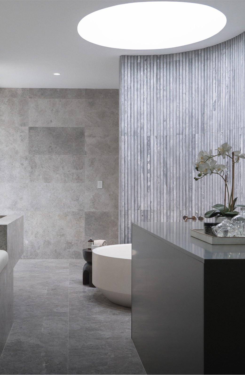 Augustus Grey tiles pair beautifully with warm timber, brass and copper fixtures, and neutral cabinetry. They complement both classic and contemporary interiors, creating seamless sophistication across large surfaces when installed with colour-matched grout.