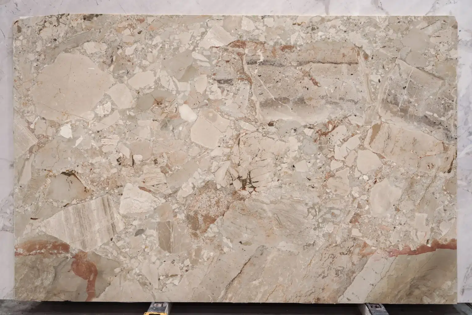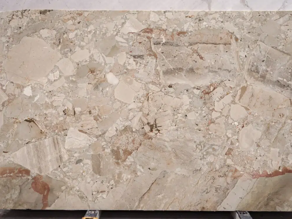 Alessia Marble presents a warm light salmon base richly interwoven with brecciated segments of deep red and burgundy tones that spread across each slab with a bold, organic energy. Subtle pink and salmon accents weave through the surface, adding layers of depth and dimension that give the stone a visually dynamic warmth, inviting yet sophisticated in equal measure. The intricate brecciated composition creates a naturally fragmented, mosaic-like character that makes every slab a genuinely unique work of natural art. A striking choice for feature walls, statement benchtops and sophisticated flooring, Alessia Marble blends classic elegance with a bold contemporary personality, bringing a refined yet distinctly warm and memorable beauty to any interior it graces.