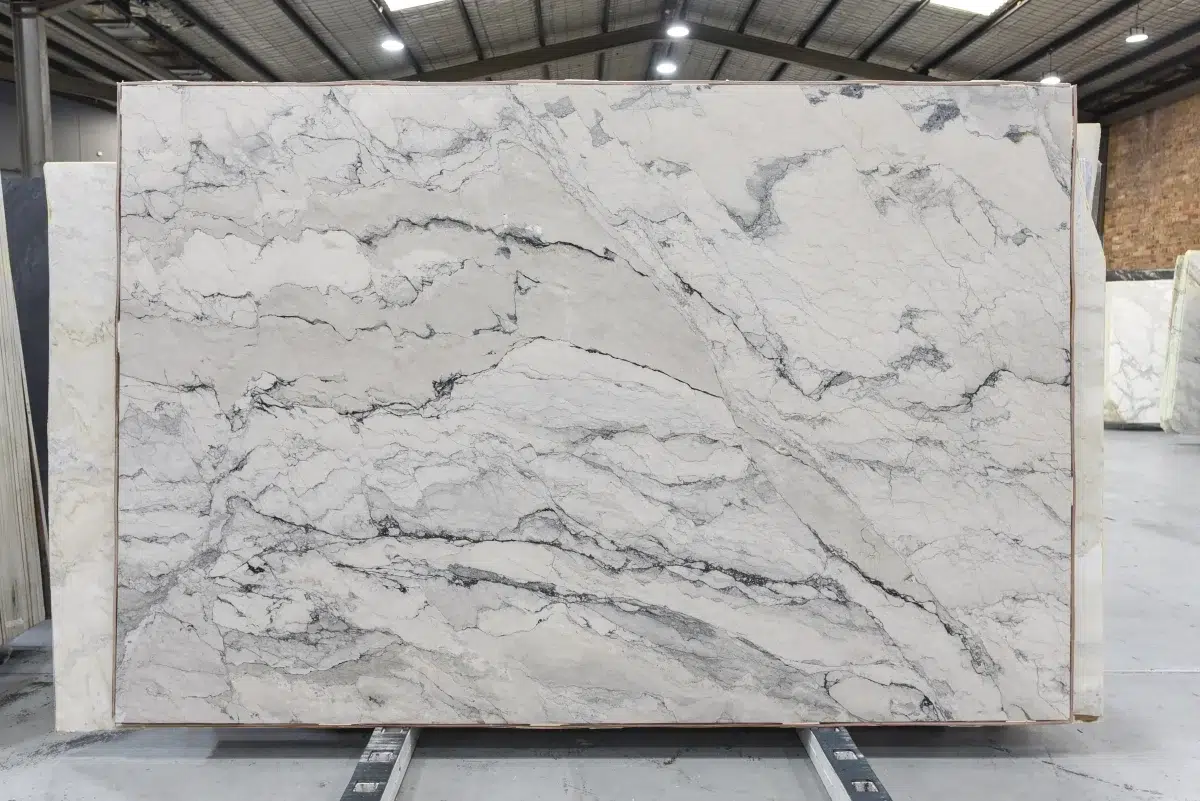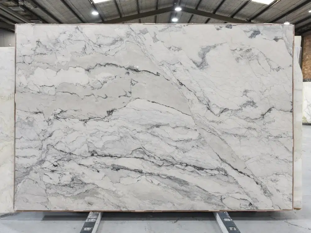 Bianco Carioca Marble is a visually captivating natural stone featuring a dynamic interplay of soft white and grey tones dramatically layered with dark grey veining and bold charcoal streaks that shift in depth and intensity across each slab. The tonal range is genuinely compelling, moving from delicate grey whispers through to strong charcoal movements that draw the eye across the surface and reveal new detail as light changes throughout the day. Despite its dramatic character, the neutral grey palette keeps Bianco Carioca remarkably versatile, pairing effortlessly with warm timber cabinetry, sleek modern finishes and both cool and warm colour schemes with equal ease. Ideal for kitchen benchtops, feature walls, bathroom vanities, splashbacks and fireplace surrounds, this is a marble bold enough to anchor a space yet sophisticated enough to complement everything around it. Like all marble, regular sealing and prompt cleanup of acidic spills will preserve its striking appearance for years to come.