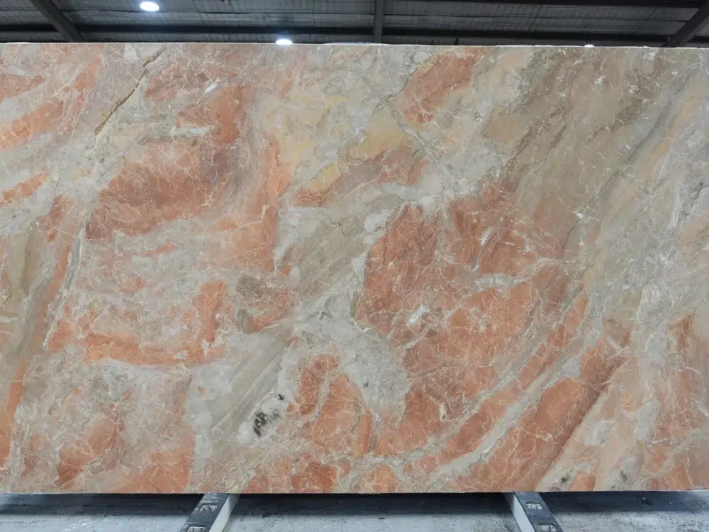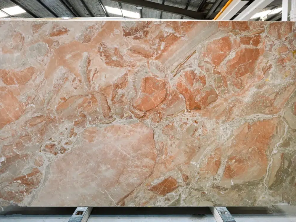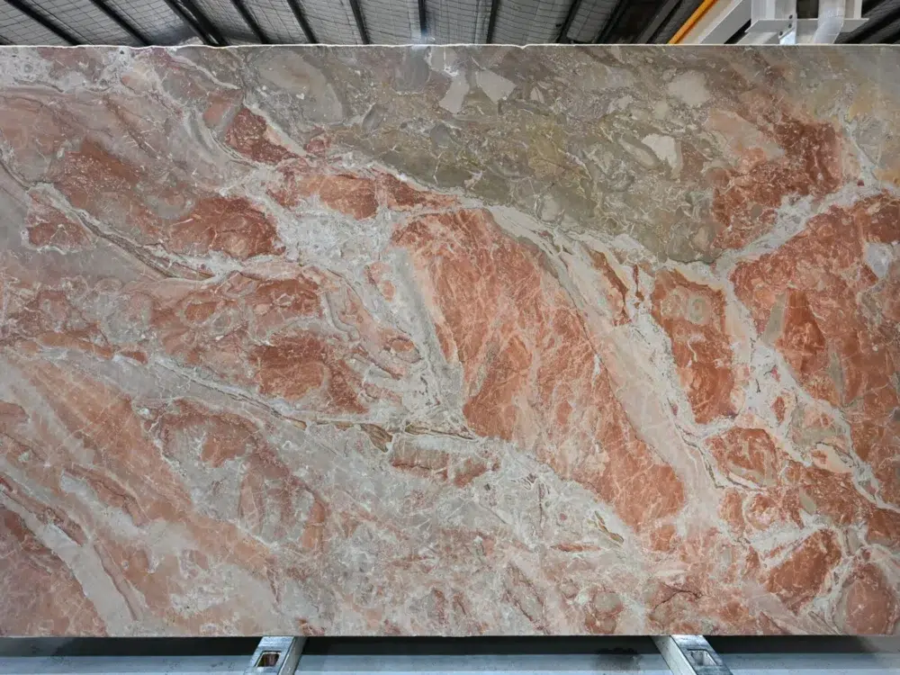 Breccia Damascata Marble is a celebration of warmth and colour, presenting a vibrant fusion of rich red, soft pink and warm orange tones scattered across the surface in a striking mosaic-like composition. Ivory veining, both bold and delicate, weaves through the brecciated fragments like ancient rivers through terracotta landscapes, adding structure and visual rhythm to what is already a deeply expressive natural stone. The term breccia refers to the geological process by which ancient rock fragments were naturally cemented together over millennia, and it is precisely this process that gives Breccia Damascata its remarkable kaleidoscopic character. Where cooler marbles offer refined elegance, this stone brings genuine warmth, energy and Mediterranean soul to any space it occupies. Ideal for feature walls, fireplace surrounds, statement benchtops and hospitality applications, it pairs beautifully with warm timber, terracotta, brass and bronze fixtures, and creates a stunning contrast against crisp white joinery or deep charcoal cabinetry for interiors that are bold, sophisticated and deeply memorable.
