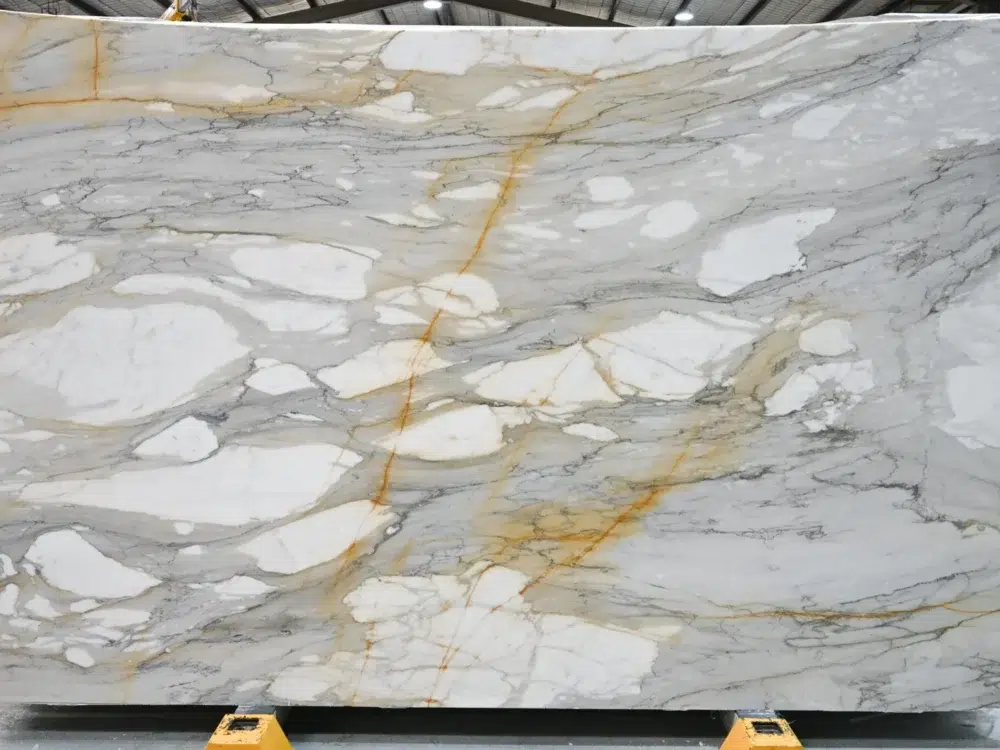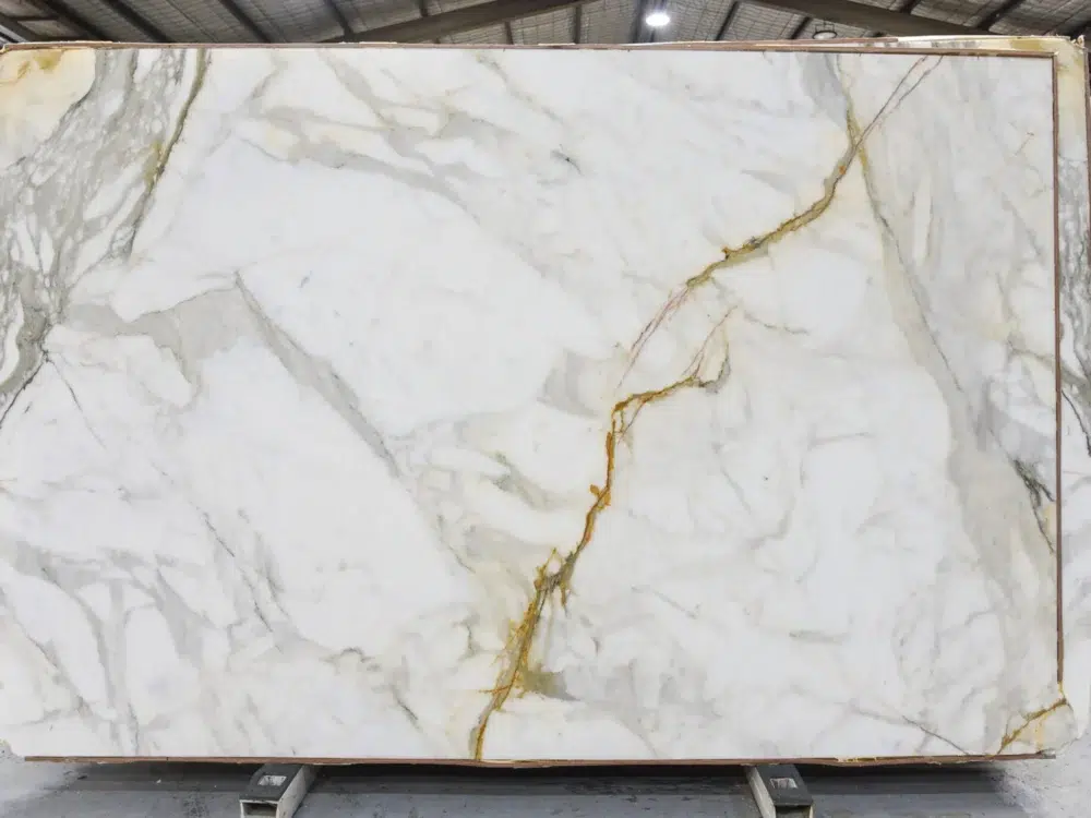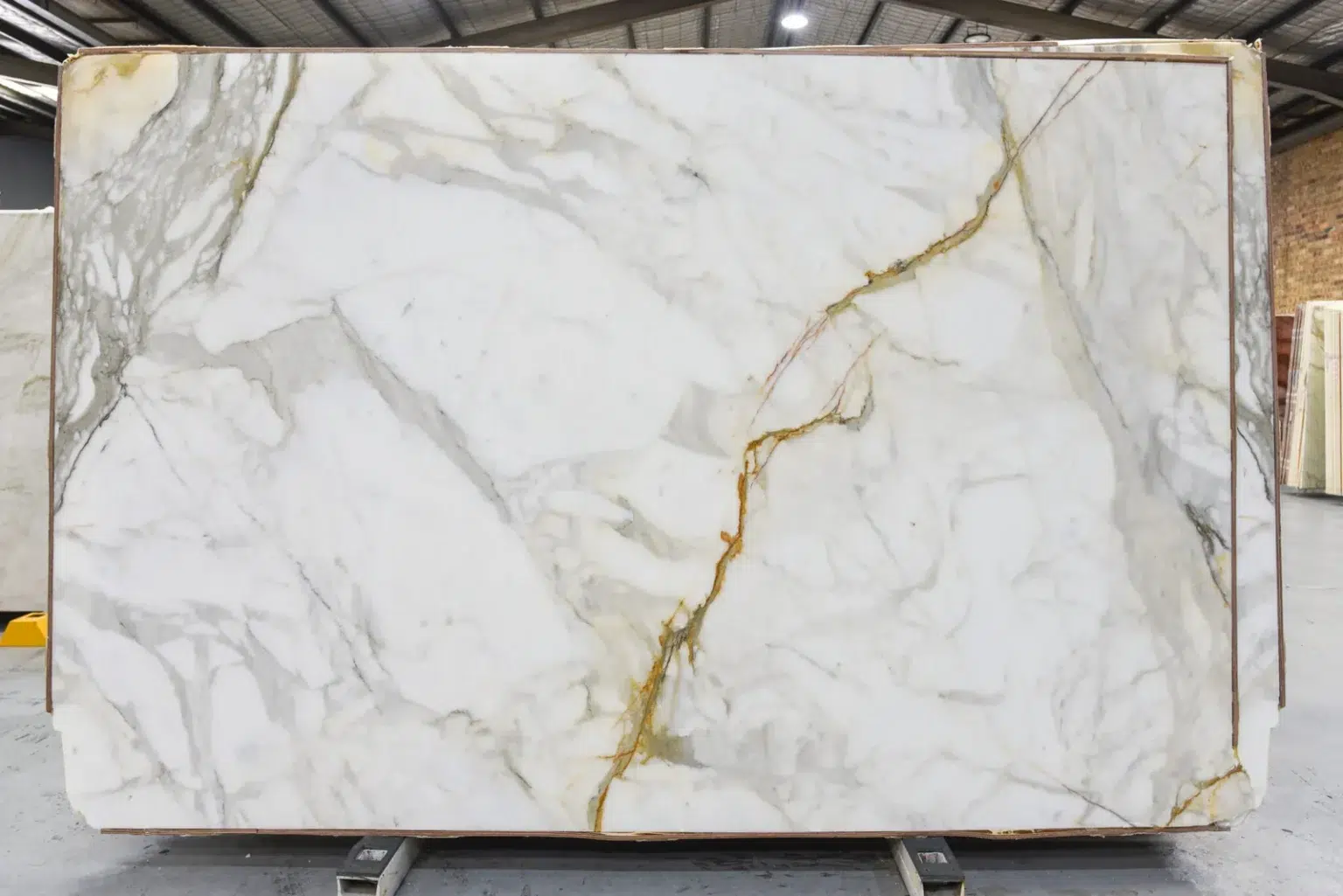 Calacatta Macchia Vecchia is Italian marble at its most refined, presenting a luminous white background elegantly traced with soft grey veining and striking gold-copper accents that add an unexpected warmth and depth to an otherwise cool, pristine canvas. The name translates from Italian as “old stain”, a poetic reference to the way those warm metallic tones appear naturally weathered into the surface, giving each slab a sense of history and aged character that feels genuinely irreplaceable. The interplay between the cool grey veining and the warm gold-copper highlights creates a sophisticated tonal contrast that sets Calacatta Macchia Vecchia apart from more conventional white marbles within the prestigious Calacatta family. Perfectly suited to kitchen benchtops, bathroom vanities, splashbacks and feature walls, it pairs beautifully with brushed brass and bronze fixtures, warm timber cabinetry and both cool and warm design palettes with effortless versatility.