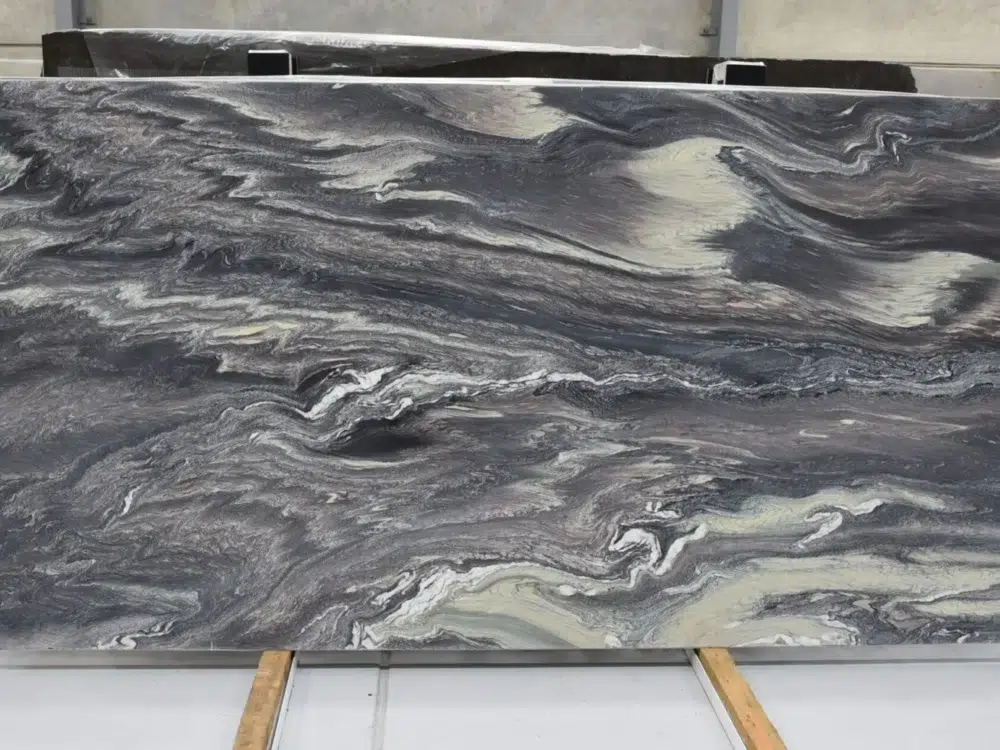 Cipollino Marble is a boldly distinctive natural stone with a deep, dark background dramatically swept with flowing waves of warm caramel and rich purple tones that move across each slab with a striking, painterly energy. The interplay between the moody dark foundation and the warm, colourful waves creates a surface of genuine depth and personality, giving the stone an exotic character that feels both dramatic and deeply sophisticated. The undulating caramel and purple tones catch the light beautifully, shifting in intensity and warmth throughout the day and revealing new layers of colour and movement with every glance. A natural standout for kitchen islands, feature walls and statement flooring, Cipollino Marble is the definitive choice for interiors that call for a bold, unforgettable natural stone with a truly one-of-a-kind personality.