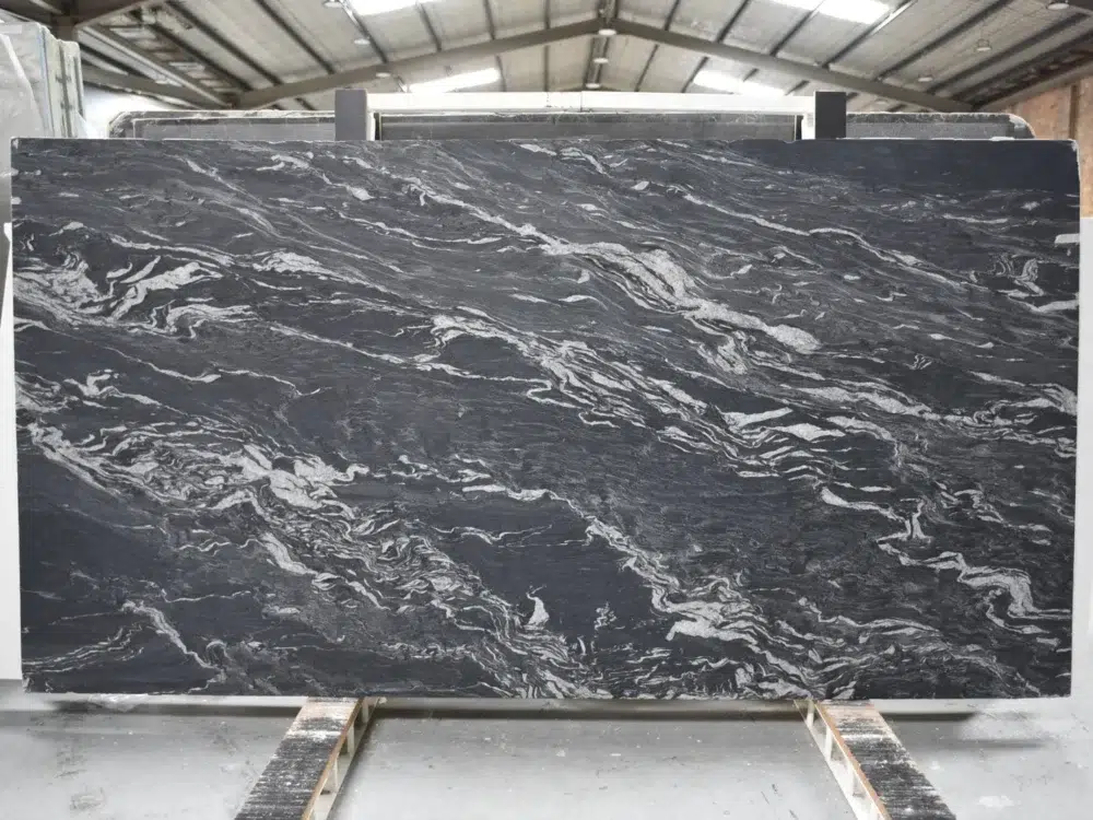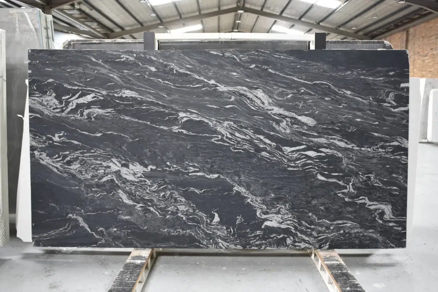 Copenhagen Marble is a study in confident simplicity, presenting an intense black background dramatically swept with stark white veining that flows across each slab like bold brushstrokes on a dark canvas. The crisp, high contrast between the deep black base and the bright white veining creates a powerful contemporary aesthetic that commands immediate attention, relying on the timeless drama of black and white rather than complex patterning or multiple colour tones. The flowing veining carries a sense of natural artistry and elegant movement that gives the stone a sophistication beyond its apparent simplicity, and in book-matched applications, the mirrored veining creates a truly breathtaking symmetrical focal point. Perfectly suited to feature walls, bathroom vanities, splashbacks, fireplace surrounds and statement benchtops, Copenhagen Marble pairs beautifully with crisp white cabinetry, matte black tapware and warm timber accents. Like all marble, regular sealing and prompt cleanup of acidic spills will preserve its striking appearance for years to come.