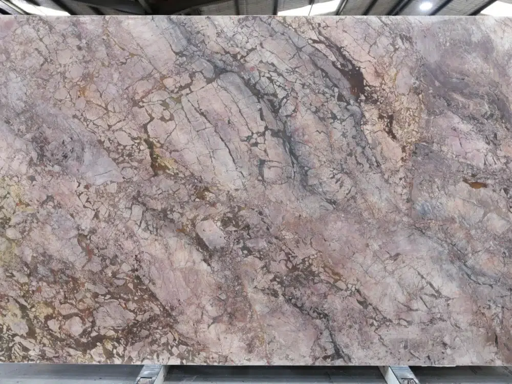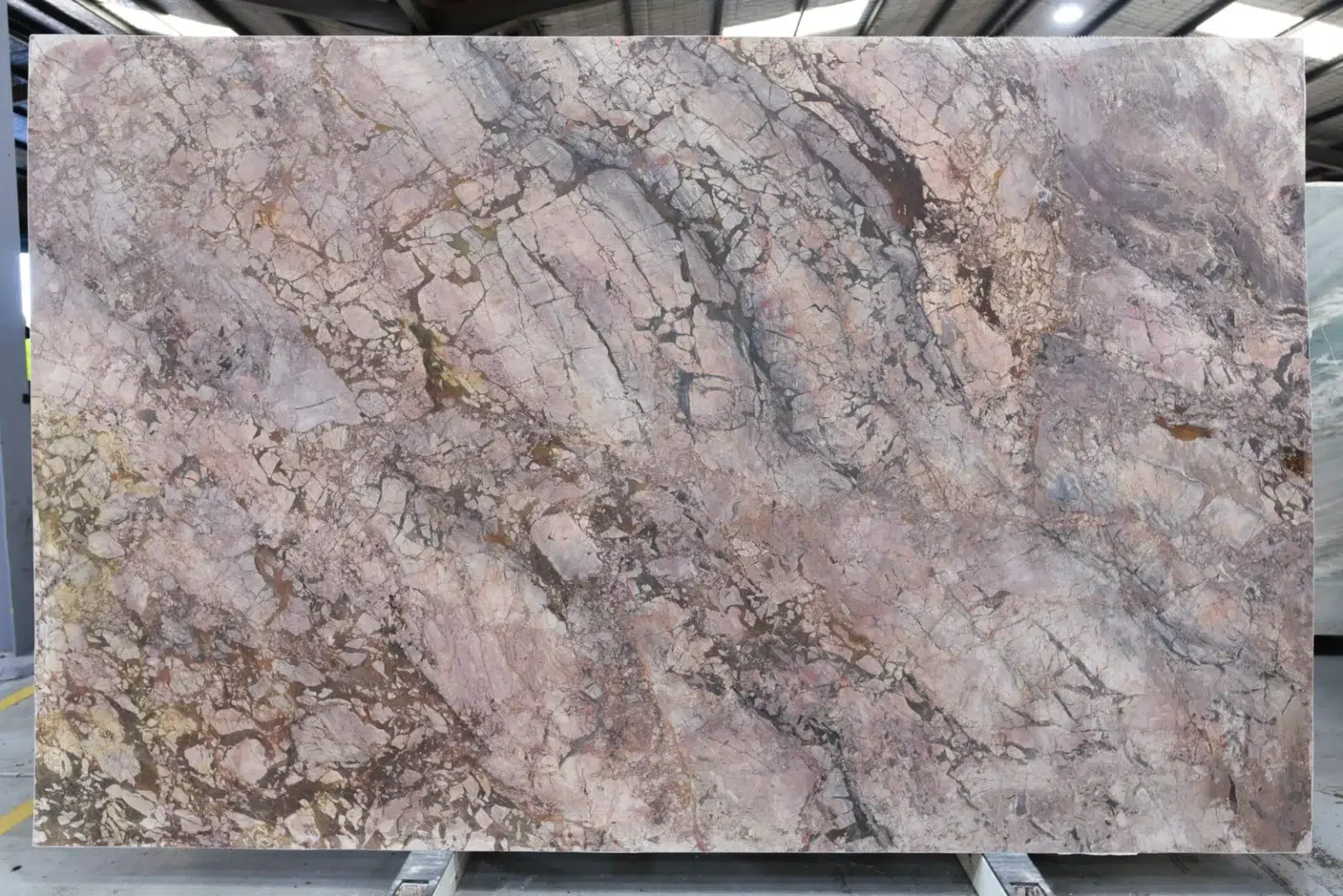 Crimson Rose Marble is a bold and captivating natural stone, presenting a richly layered composition of deep burgundy, soft pink and warm gold tones that blend across each slab with a striking, almost painterly beauty. The staggered veining moves through the surface with an organic, irregular energy that adds genuine natural texture and depth, giving the stone a dynamic character that feels both dramatic and artistically expressive. The interplay between the rich crimson tones, the softer blush accents and the warm gold highlights creates a surface that catches light beautifully and reveals new layers of colour and movement throughout the day. A stone for those who embrace bold, adventurous design, Crimson Rose Marble makes an unforgettable statement on feature walls, statement benchtops, bathroom vanities and luxury flooring, bringing a rare and captivating warmth to interiors that celebrate the extraordinary beauty of natural stone.