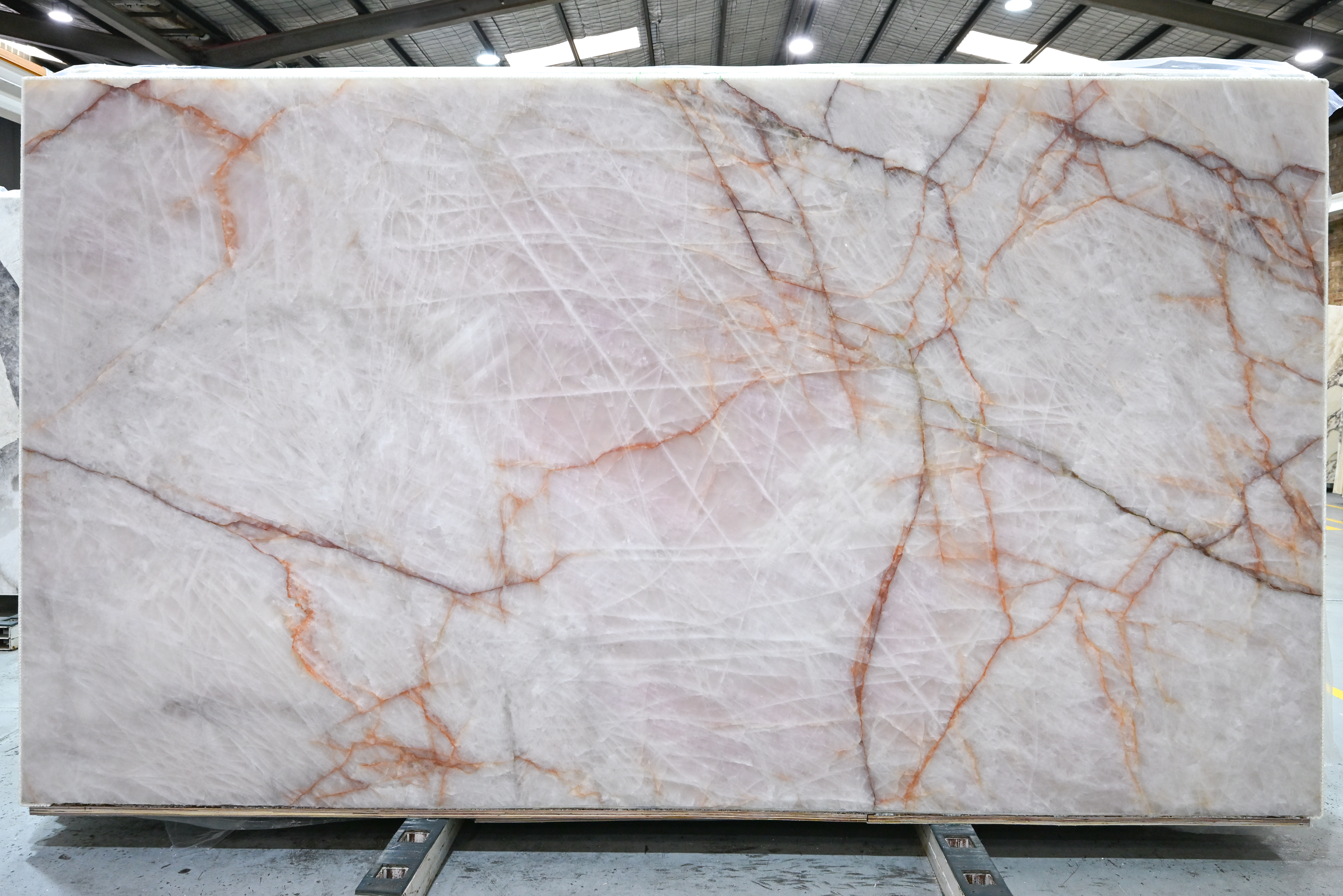 Cristallo Rosa Quartzite embodies a harmonious blend of a delicate pink base with vibrant copper veining, offering a rich and dynamic aesthetic. The subtle crystalline texture combined with the bright copper accents infuses the space with warmth and sophistication. This striking natural stone provides an elegant focal point, perfect for creating luxurious surfaces in both modern and classic interiors.