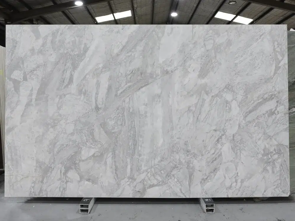 Epoca Marble is a visually dynamic natural stone with a clean ivory white base beautifully scattered with cool grey veining that moves across each slab like delicate brushstrokes in an abstract artwork. The generous, high-movement patterning creates a surface that feels genuinely artistic and expressive, with the balanced interplay of grey and white tones generating a refined visual energy that draws the eye across the stone with a captivating, almost rhythmic quality. Unlike more restrained white marbles, Epoca embraces movement and pattern with confidence, offering a bold contemporary presence that transforms any surface into a genuine focal point. The artistic texture and dynamic veining reward closer inspection while making an immediate and striking impression from a distance. Perfectly suited to feature walls, kitchen benchtops and expansive flooring applications where the sweeping grey patterning can flow uninterrupted, Epoca Marble brings a sophisticated artistic character to both residential and commercial interiors that seek natural beauty with a bold, contemporary edge.