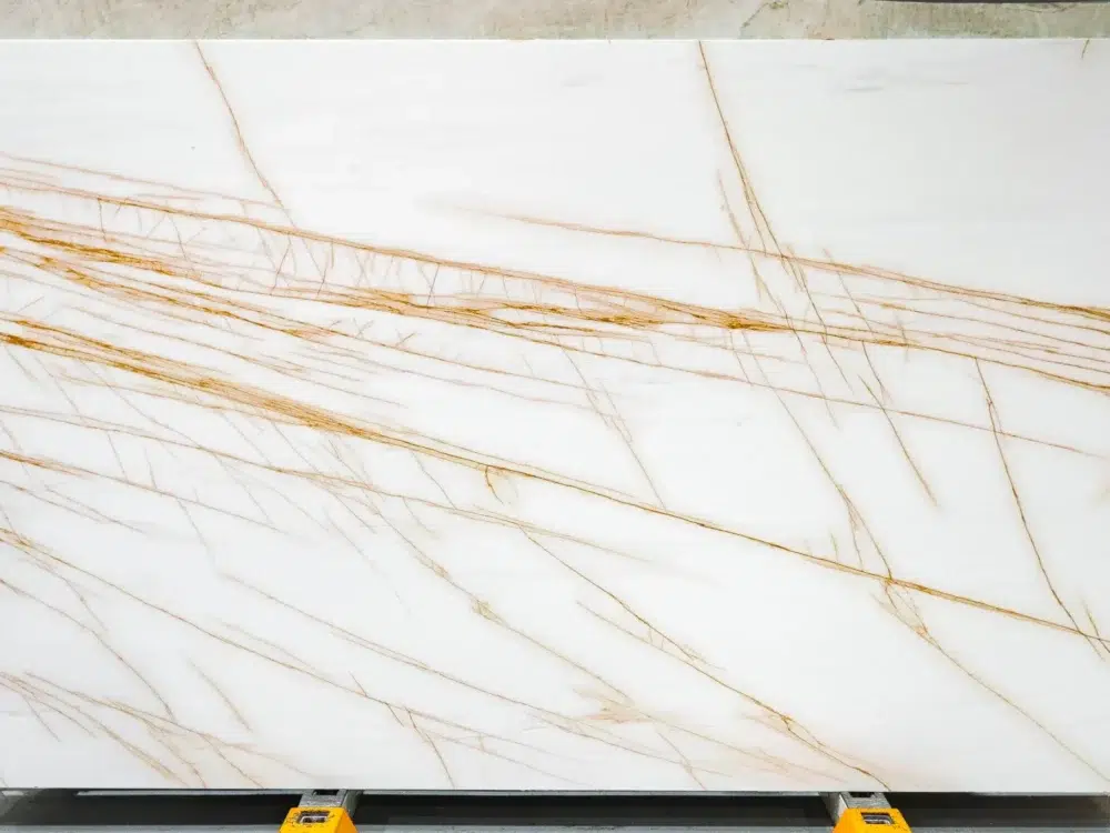 Golden Spider Marble presents a warm white base beautifully animated by intricate, angular gold veining that spreads across each slab in a striking web-like pattern full of natural movement and depth. Delicate hints of soft pink weave through the surface alongside the rich gold tones, adding a subtle warmth and femininity that gives the stone a distinctly inviting and sophisticated character. The fine, angular nature of the veining creates a surface that feels genuinely intricate and jewel-like, catching light from every angle and revealing new layers of warm gold and blush detail as it shifts throughout the day. The harmonious blend of the clean white base, the rich angular gold veining and the soft pink accents strikes a rare balance between bold visual impact and refined elegance, making Golden Spider Marble an inspired choice for kitchen benchtops, bathroom vanities, feature walls and splashbacks across both contemporary and classic interior settings.