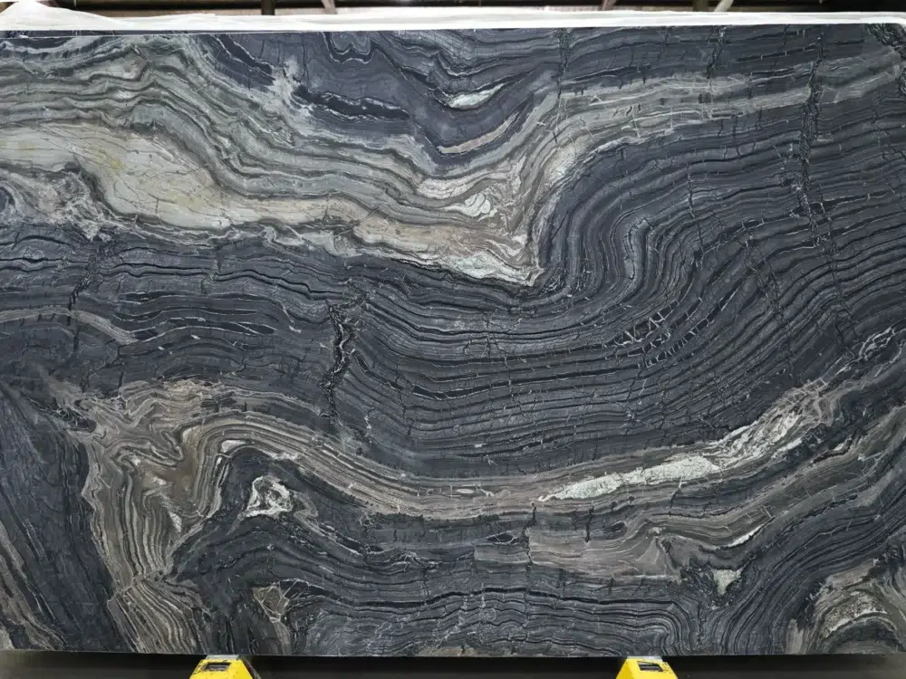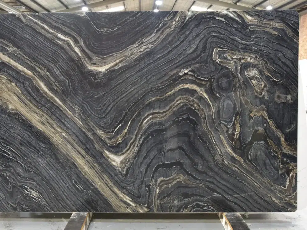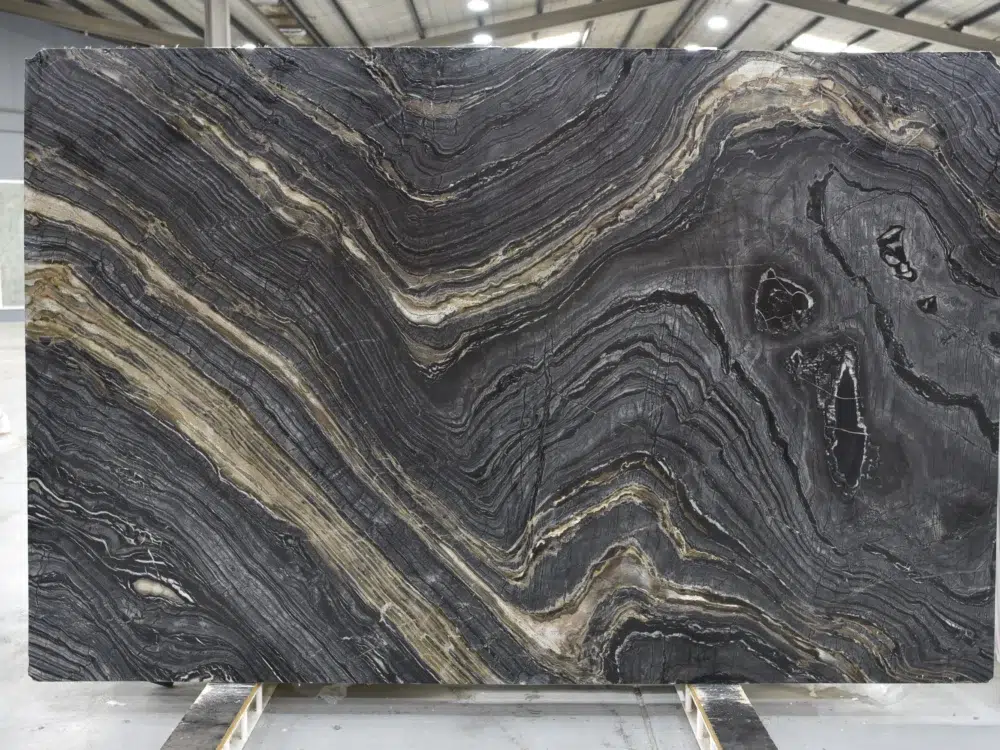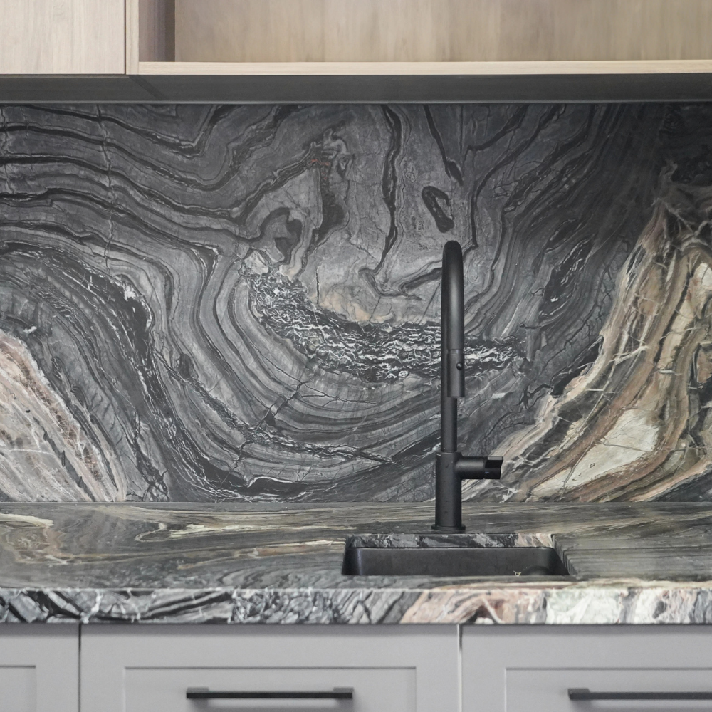 Jurassic Black Marble is a stone of remarkable character and presence, presenting a deep black background dramatically brought to life by prominent grey and warm brown veining that protrudes from the surface with a bold, organic energy that immediately captures the eye. The striking contrast between the intense black base and the rich, expressive veining creates a surface full of life and natural movement, giving the stone a dynamic personality that feels powerful yet deeply sophisticated in equal measure. No two slabs are alike, each carrying its own unique interpretation of this dramatic patterning that makes every installation a genuinely one-of-a-kind statement. Available in honed, leathered and polished finishes, each surface option reveals a different dimension of the stone’s character, from the smooth contemporary refinement of the honed finish through to the tactile depth of the leathered surface and the mirror-like brilliance of the polished option. A natural standout for feature walls and splashbacks, Jurassic Black Marble brings an unmistakable sense of sophistication, life and movement to any interior that embraces the extraordinary drama of dark natural stone.