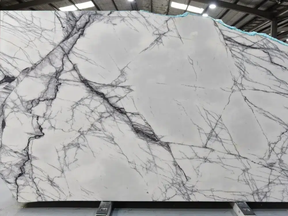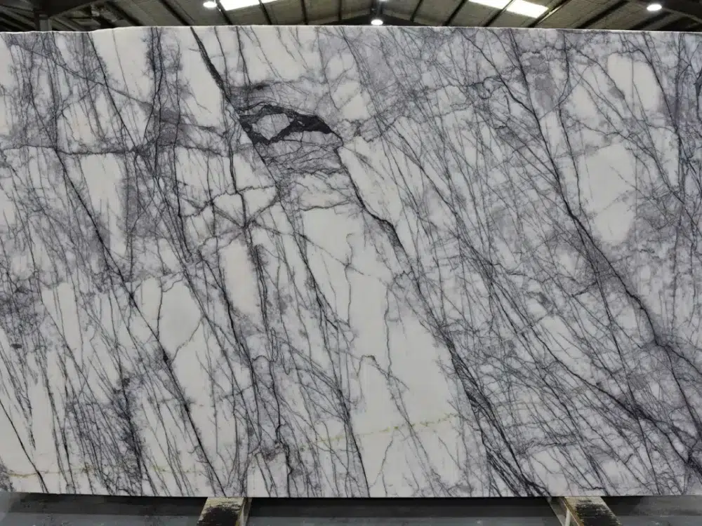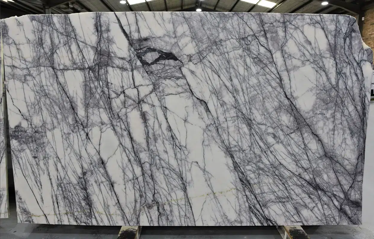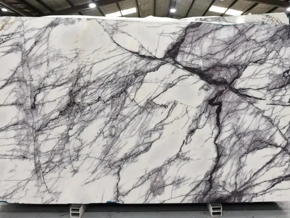 New York Marble is a bold and genuinely spectacular natural stone with a crisp white background dramatically swept by sharp, dark purple veining and rich hues of pink and violet that move across each slab with a heavy, striking visual energy that lives up to its iconic namesake. The intense purple tones and generous movement create a surface of extraordinary character and presence, making an immediate and unforgettable impression that sets it firmly apart from more conventional white marbles. What makes New York Marble truly exceptional is its remarkable translucent quality, where light passes through the stone’s natural structure to reveal the full depth and vibrancy of the purple and pink tones in a way that transforms any installation into something genuinely magical. In backlit applications, this stone reaches its full breathtaking potential, the veining illuminated from within to create a luminous, jewel-like feature that captivates everyone who encounters it. Perfectly suited to feature walls, kitchen islands, bathroom vanities and high-end commercial applications, New York Marble is the defining choice for interiors that demand a stone with genuine drama, rare translucent beauty and an unforgettable visual presence that makes a statement from every angle.