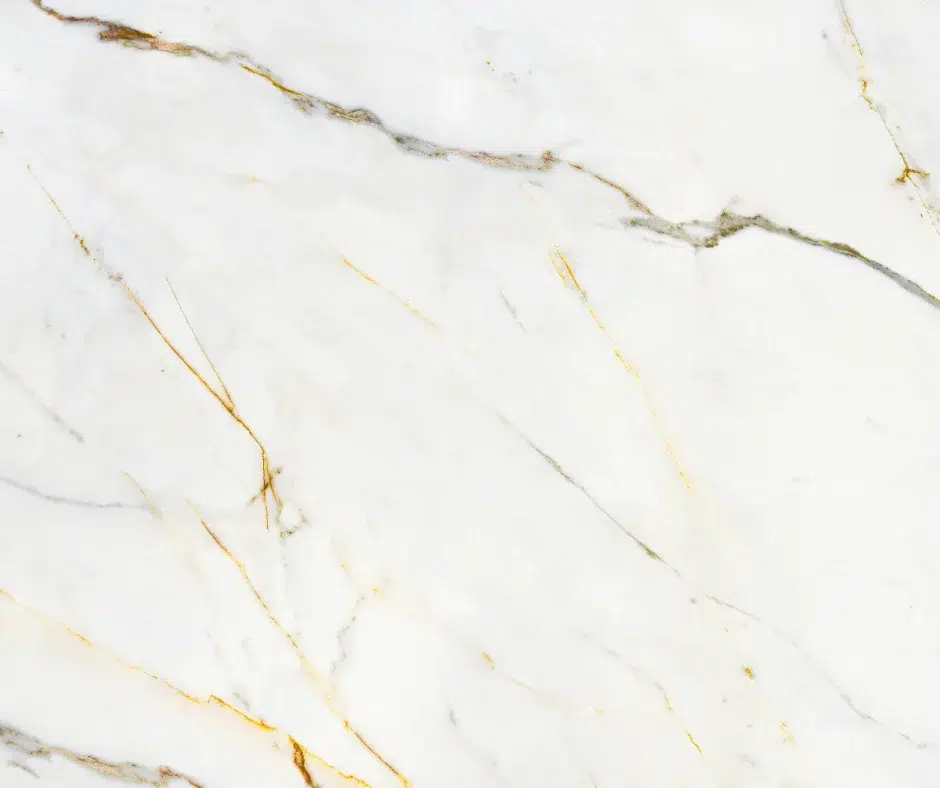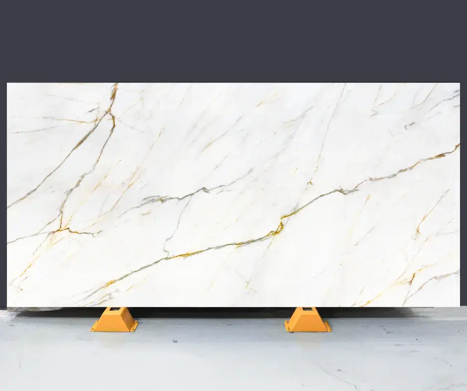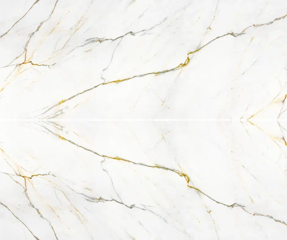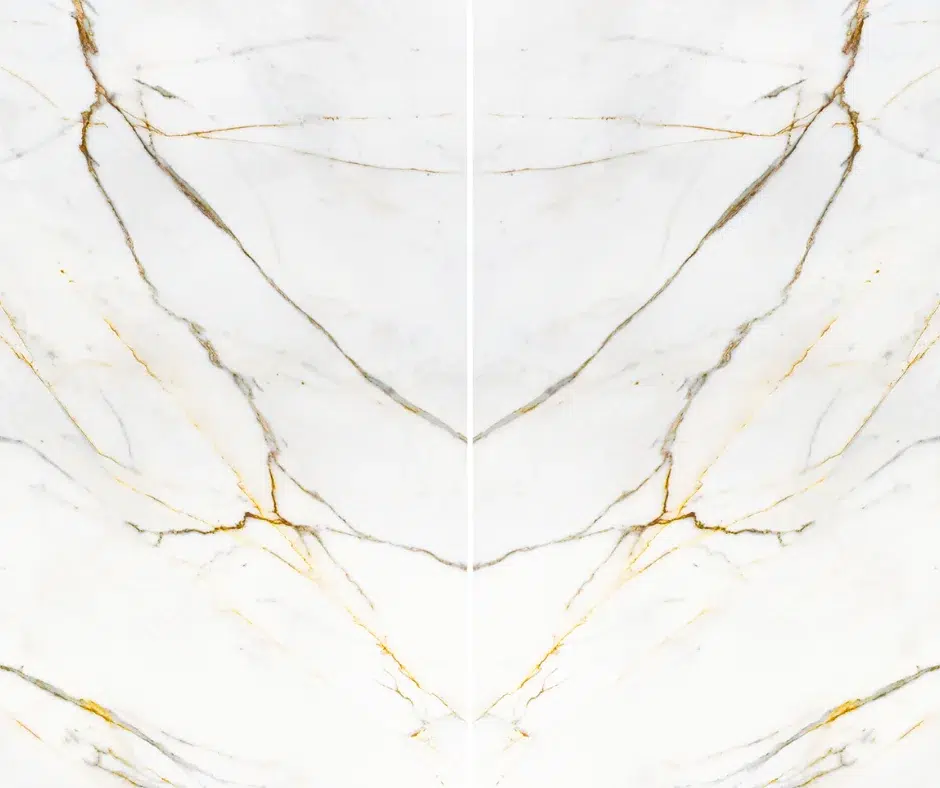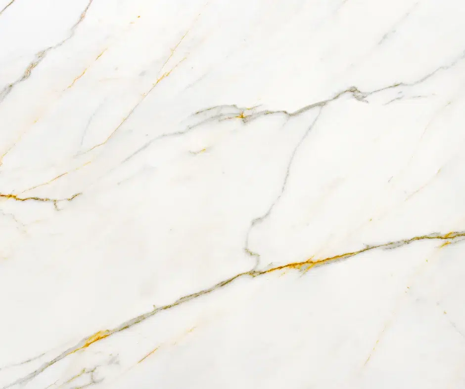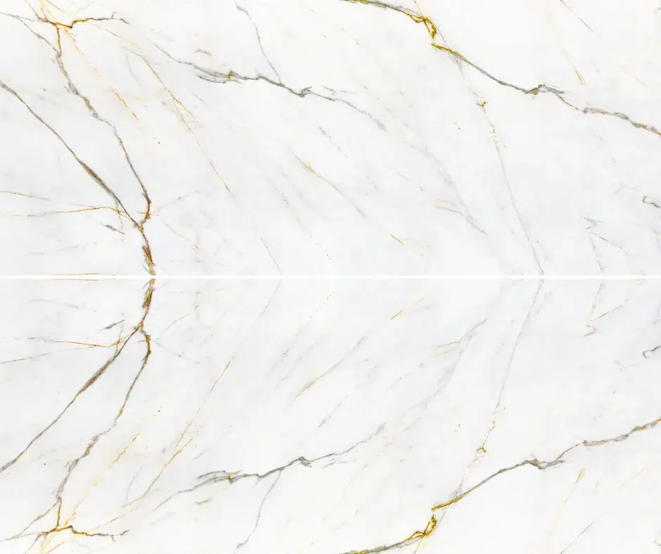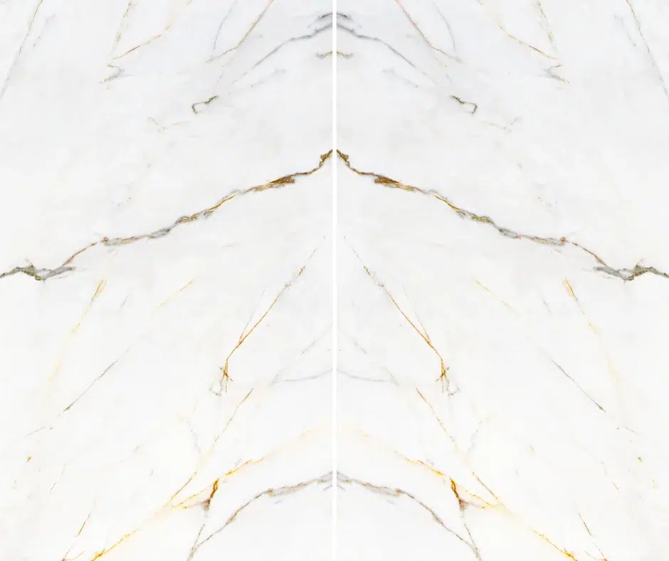 Aurelia’s sintered stone captivates with a white ivory base, intricately detailed by bold, angular veining in rich gold and soft grey. The striking veins cut through the surface with precision, creating a dynamic yet balanced pattern reminiscent of the finest natural marble, but with all the practical advantages sintered stone offers.