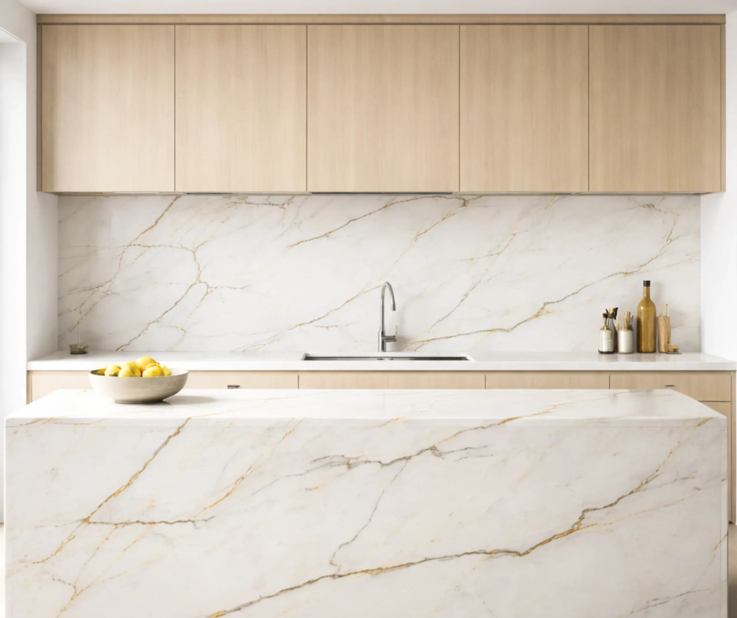 What makes Aurelia exceptional is its ability to deliver marble-like luxury without marble’s demanding maintenance. This 12mm sintered porcelain slab offers complete resistance to staining, scratching, and heat, with no sealing required. Ever. Acidic spills that would etch natural marble simply wipe away, making Aurelia ideal for busy kitchens where both beauty and performance matter.