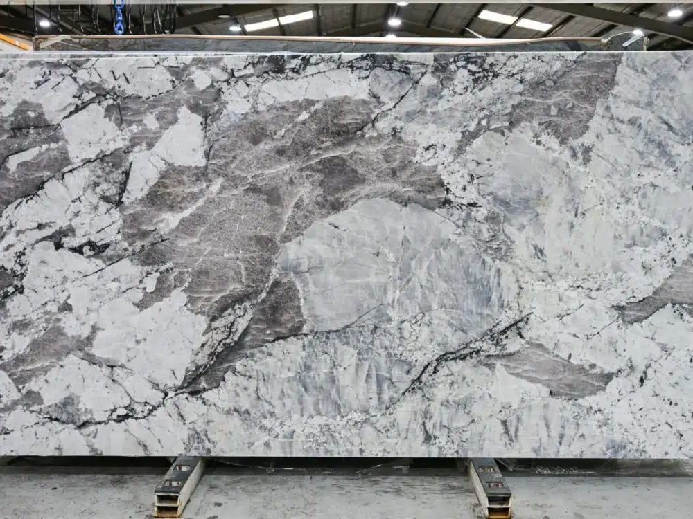 Patagonia Silver Quartzite is a genuinely captivating natural stone with a refined crystalline structure and bold, expressive veining that moves across each slab with a dramatic artistic energy that is impossible to ignore. A striking palette of cool silvers, soft greys, icy blues and luminous ivory whites creates a high contrast composition of remarkable visual depth, while areas of translucent mineralisation catch and refract light with a breathtaking, almost gemstone-like quality that sets this quartzite firmly apart from more conventional stone options. The interplay between the cool, icy tones and the warm ivory highlights creates a surface that feels simultaneously crisp and inviting, bold yet deeply sophisticated in a way that suits both contemporary and classic high-end interiors with equal elegance. As a quartzite, Patagonia Silver offers exceptional durability and natural strength, making it as well suited to the demands of a busy kitchen benchtop as it is to a dramatic feature wall installation. Perfectly suited to statement benchtops, feature walls and luxury interior accents, it pairs beautifully with brushed nickel and chrome fixtures, crisp white joinery and cool-toned timber, bringing a rare crystalline beauty and dramatic natural sophistication to any interior that demands something truly extraordinary.