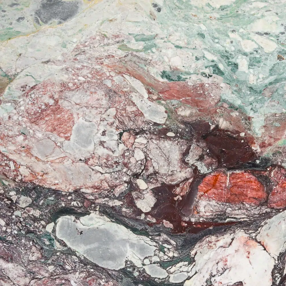 Quattro Saison is a distinctive marble defined by its expressive composition and rich interplay of colour. Layers of soft pinks, deep reds, and muted sage greens are woven together through bold, dramatic veining, creating a surface that feels both artistic and architectural. Each slab is entirely unique, offering a one-of-a-kind statement that elevates interiors with depth, movement, and character.