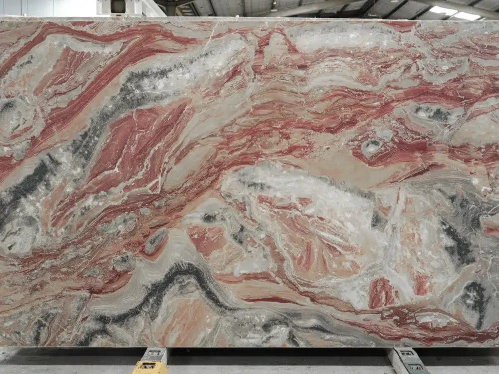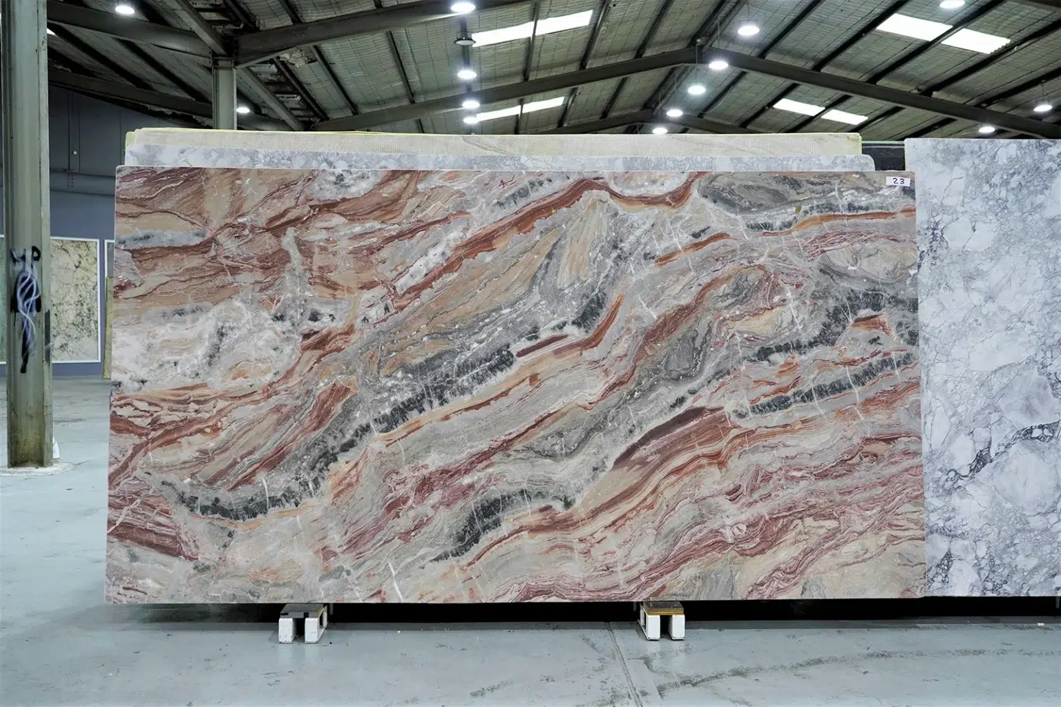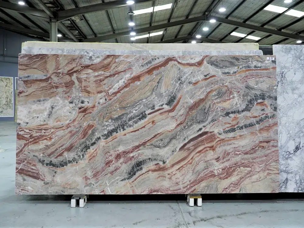Rosso Orobico Marble is a breathtakingly opulent natural stone with a luxuriously deep red base richly swept by waves of tawny sunset rose and a dramatic range of white, black, burgundy, brown and grey tones that blend across each slab with a boldness and complexity that feels like the work of a master artist rather than the forces of geological time. The extraordinary range of colours woven through the stone creates a surface of remarkable depth and visual richness, each tonal shift revealing a new layer of warmth and character that rewards extended admiration from every angle and in every light condition. No two slabs carry the same interpretation of this remarkable natural composition, making every installation a genuinely unique and emphatic statement of natural luxury. The sweeping waves of colour and intricate patterning make Rosso Orobico particularly spectacular in large-format applications, where the full drama of the stone can flow uninterrupted across feature walls and statement kitchen islands. Perfectly suited to feature walls, kitchen islands, fireplace surrounds and luxury bathroom vanities, Rosso Orobico Marble brings a deeply dramatic, richly coloured and timelessly opulent natural beauty to any interior bold enough to celebrate it.