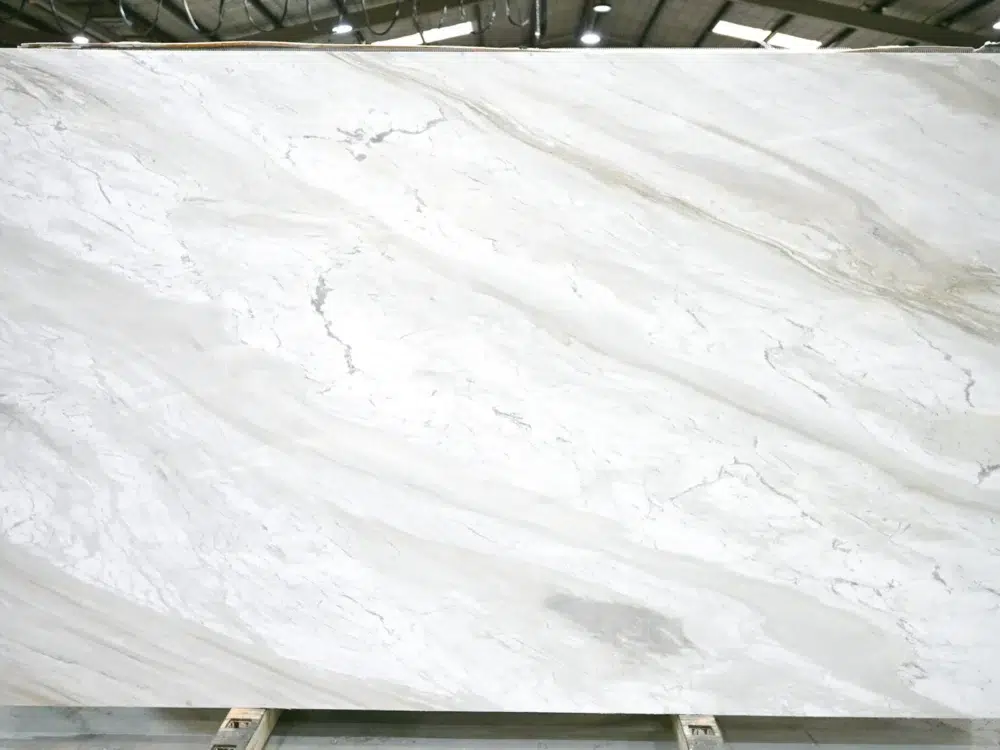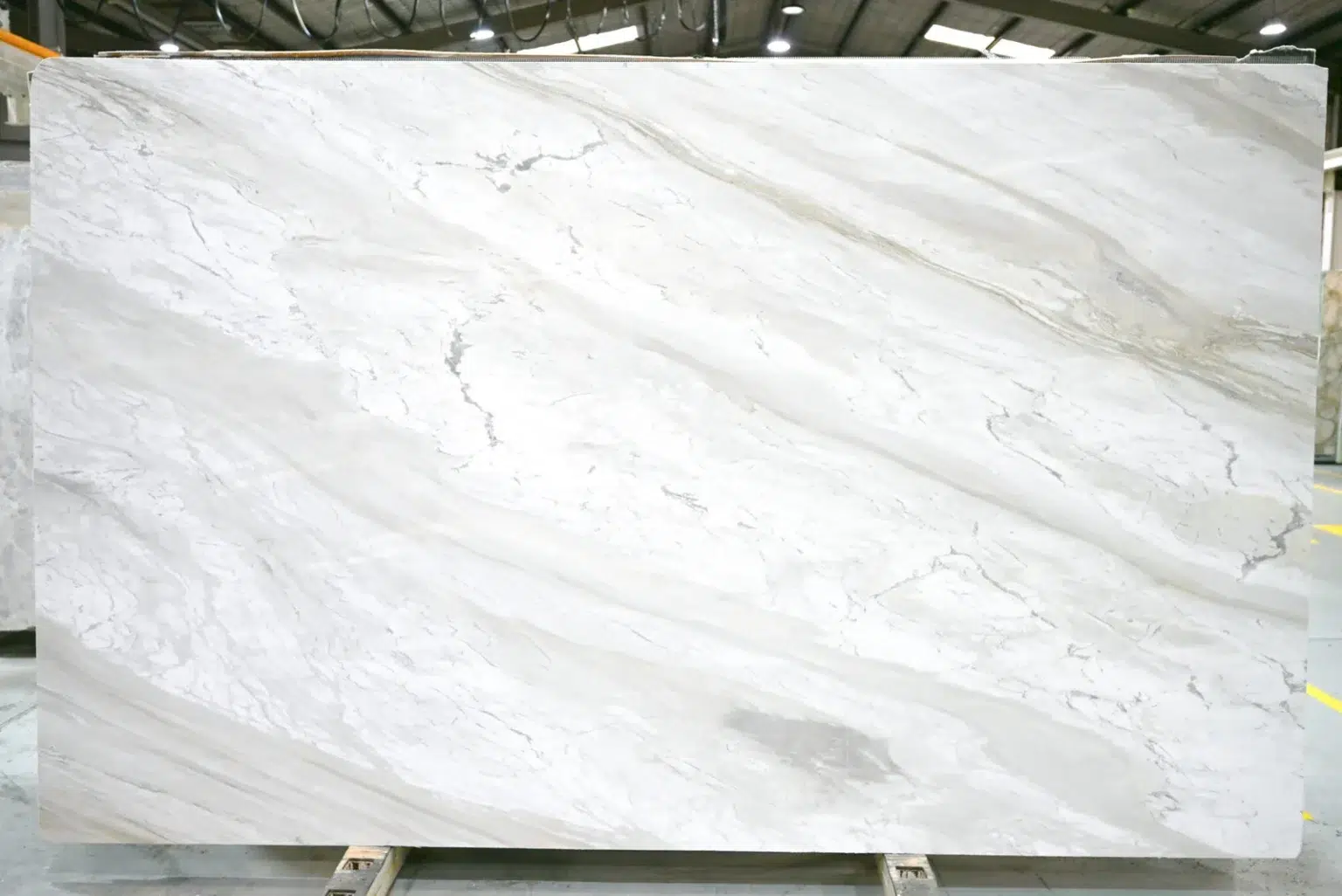 Santo Gold Marble is a beautifully refined natural stone with a soft white base elegantly woven with fluid waves of light grey and subtle golden undertones that drift across each slab with a graceful, natural movement. The gentle gold highlights add a warm luminosity that elevates the stone beyond a conventional white marble, catching light with a quiet richness that feels sophisticated and inviting without ever tipping into excess. The fluid veining creates a sense of organic flow and rhythm across the surface, giving the stone a genuinely dynamic quality and revealing new layers of warmth and detail as light shifts throughout the day. Perfectly suited to kitchen benchtops, bathroom vanities, feature walls and luxury flooring, Santo Gold Marble pairs beautifully with brushed brass fixtures, warm timber cabinetry and soft neutral tones, bringing a balanced combination of brightness, natural texture and understated opulence to any high-end interior that appreciates the quiet elegance of truly refined natural stone.