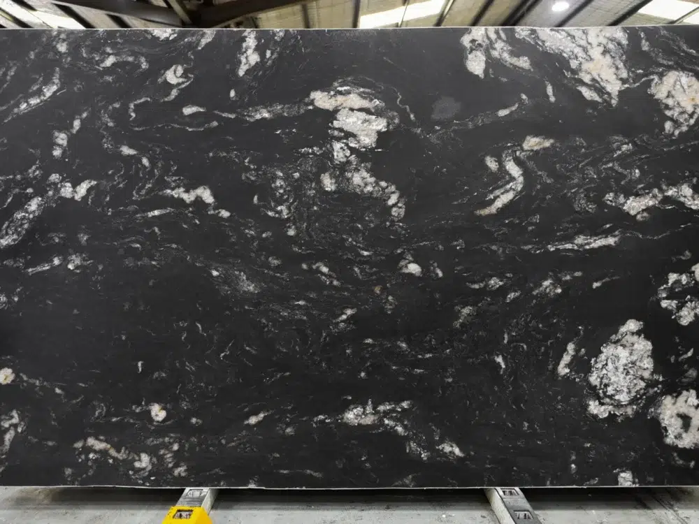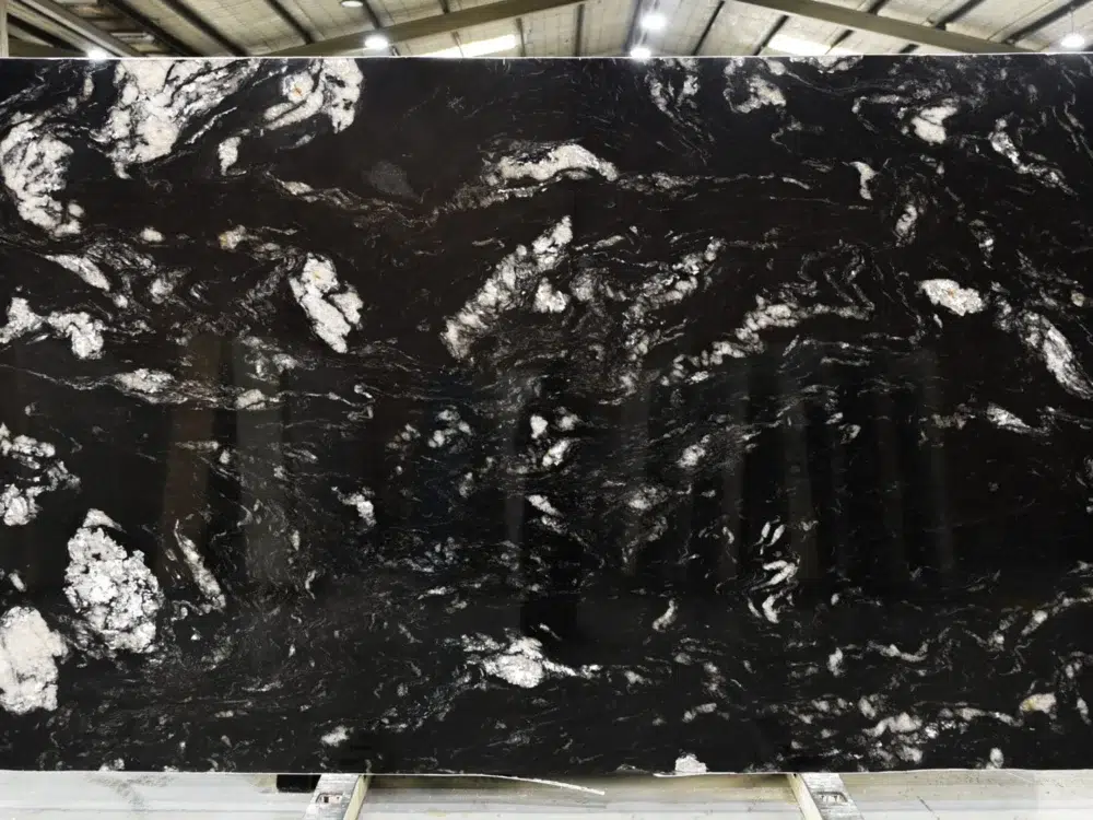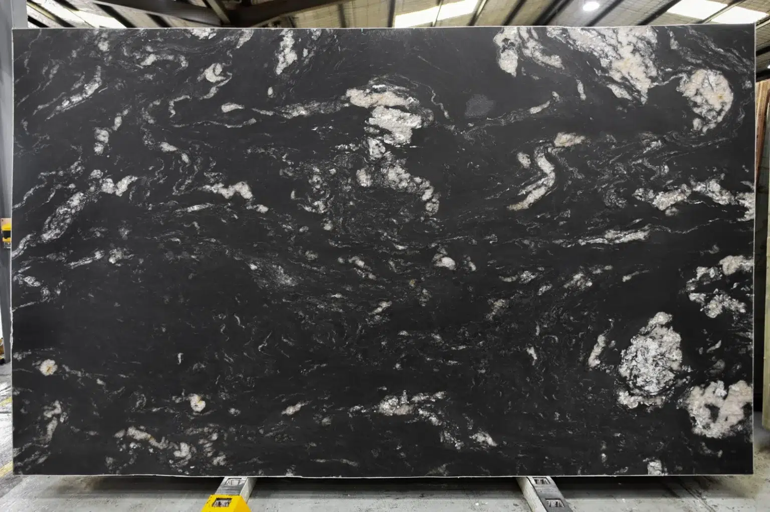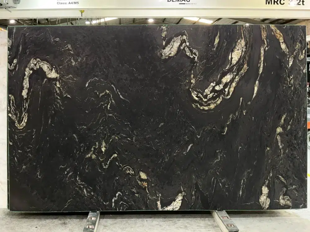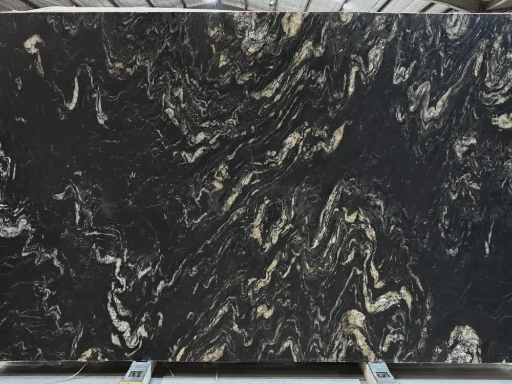 Titanium Granite is a dramatically striking natural stone with an intense black background bursting with irregular white and gold crystallisations that scatter across each slab like stars captured in stone, creating a galaxy-like movement and elegance that is genuinely difficult to replicate in any other material. The milky white and gold tones move through the deep black foundation like satin against obsidian, catching light with a brilliant luminosity that shifts and glows throughout the day with a captivating, ever-changing energy. As a granite, Titanium offers exceptional durability, natural heat resistance and outstanding strength, making it as practical and reliable for high-use kitchen benchtops as it is striking on feature walls, accent walls and outdoor cladding applications. Its bold, timeless black and gold palette pairs beautifully with warm timber cabinetry, brushed brass fixtures and crisp white joinery, bringing a vivid, elegant and unmistakably sophisticated natural drama to both interior and exterior spaces that embrace the extraordinary character of premium dark natural stone.
