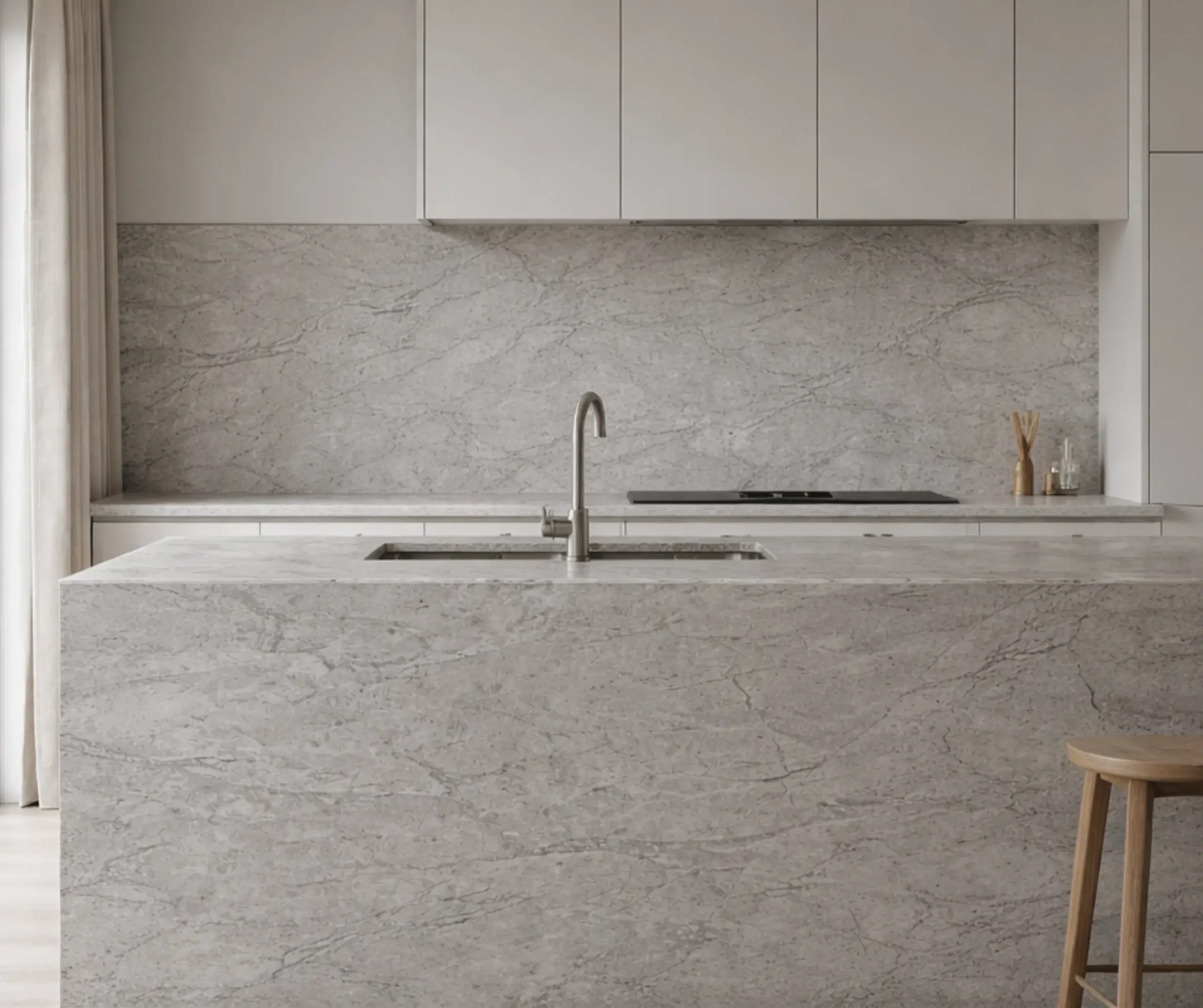 The visual effect is mesmerising. Soft grey swirls drift across the ivory backdrop like wisps of cloud, creating intricate patterns and gentle tonal contrasts that feel both organic and refined. Unlike heavily veined stones that demand attention, Dover White offers sophisticated subtlety, a beauty that reveals itself gradually and never overwhelms the space.