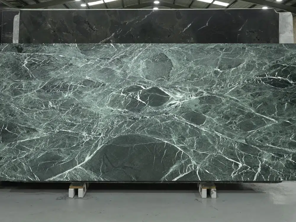 Verde Tinos Marble is a richly captivating natural stone named after the celebrated Greek island of Tinos, presenting a deep forest green base beautifully threaded with intricate white veining and varying shades of lighter green that move across each slab with a layered, dynamic complexity that feels simultaneously dramatic and deeply refined. The deep green tones shift between darker and lighter hues throughout each slab, creating a tonal depth and visual richness that rewards closer inspection and reveals new details as light moves across the surface throughout the day. The crisp white veining cuts through the rich green foundation like natural brushstrokes, adding a striking contrast and sense of movement that gives the stone a genuinely artistic quality and Mediterranean elegance that few natural stones can replicate. Perfectly suited to feature walls, statement benchtops, bathroom vanities, fireplace surrounds and flooring, Verde Tinos pairs beautifully with gold and brass fixtures, warm timber accents and crisp white cabinetry, bringing a bold, luxurious and deeply sophisticated natural drama to both contemporary and traditional interior settings. Like all marble, regular sealing every one to two years and prompt cleanup of acidic spills will preserve its stunning appearance.