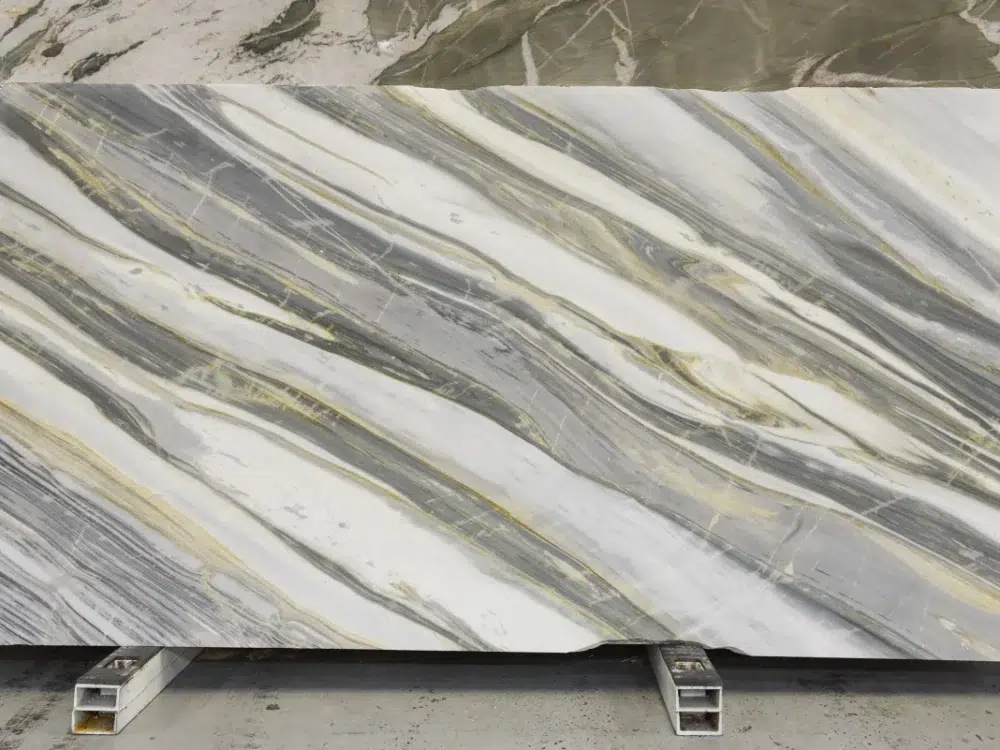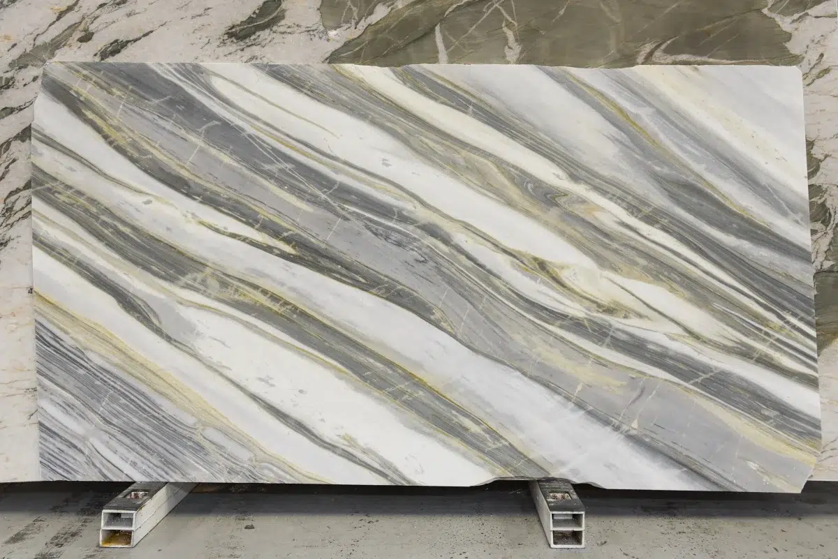 Volakas Azure Marble is a truly captivating natural stone with a luminous alabaster white background dramatically swept by thick ribbons of warm grey and gold that move across each slab with a bold, fluid energy that immediately draws the eye and holds it with a mesmerising visual intensity. The generous scale of the ribboned veining creates a striking sense of movement and drama, giving the stone a confidence and presence that feels both powerfully expressive and deeply refined in equal measure. The contrasting interplay between the pristine white base and the rich grey and gold tones creates a surface of genuine visual depth, the warm gold accents catching light throughout the day and shifting from a subtle warmth to a richer, more pronounced luminosity that gives the stone a dynamic, jewel-like quality. Perfectly suited to feature walls, kitchen benchtops, bathroom vanities and fireplace surrounds, Volakas Azure Marble pairs beautifully with brushed-gold and brass fixtures, warm timber cabinetry and crisp white joinery, bringing a bold, breathtaking natural elegance to any interior that appreciates the extraordinary drama of truly exceptional natural stone.